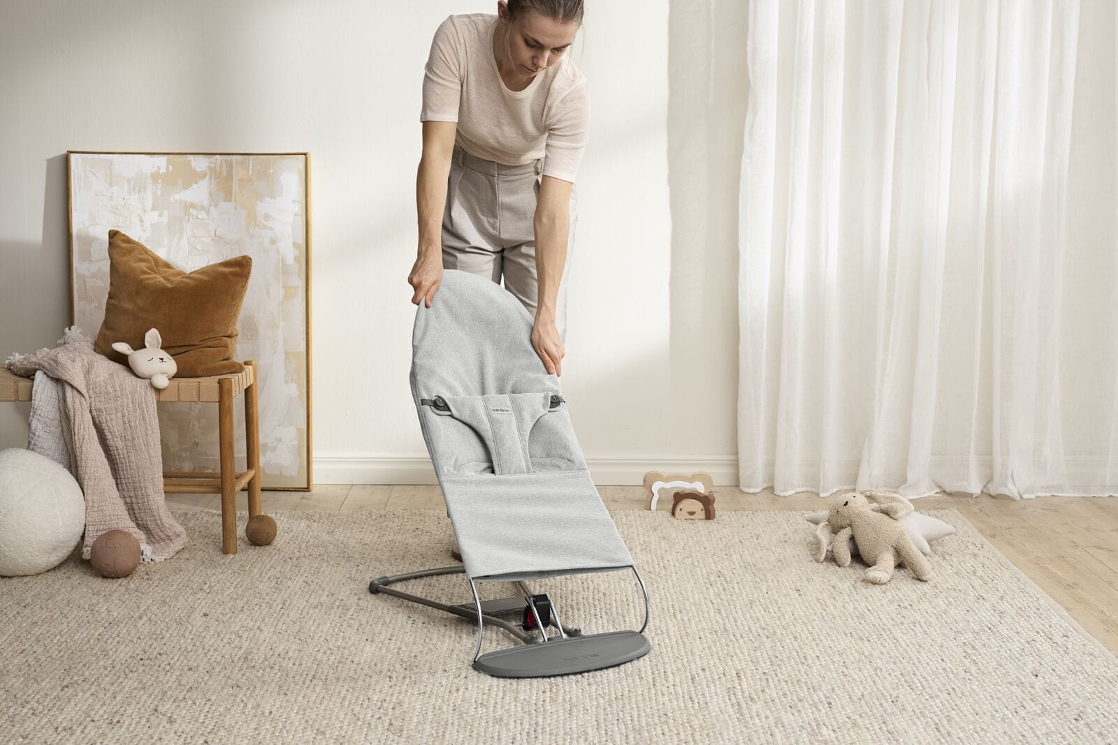 Leżaczek BabyBjörn kołysze się naturalnie – ruch generowany jest przez dziecko. W odróżnieniu od modeli z wibracjami czy muzyką zasilanych baterią lub sieciowo, jest lżejszy i łatwiejszy do przenoszenia, a rytm kołysania nadaje sam maluch.