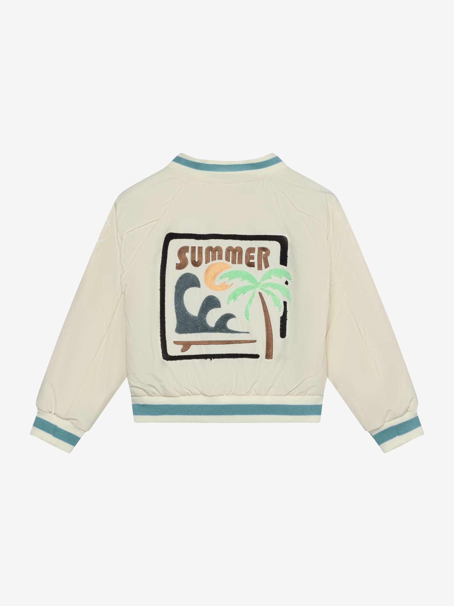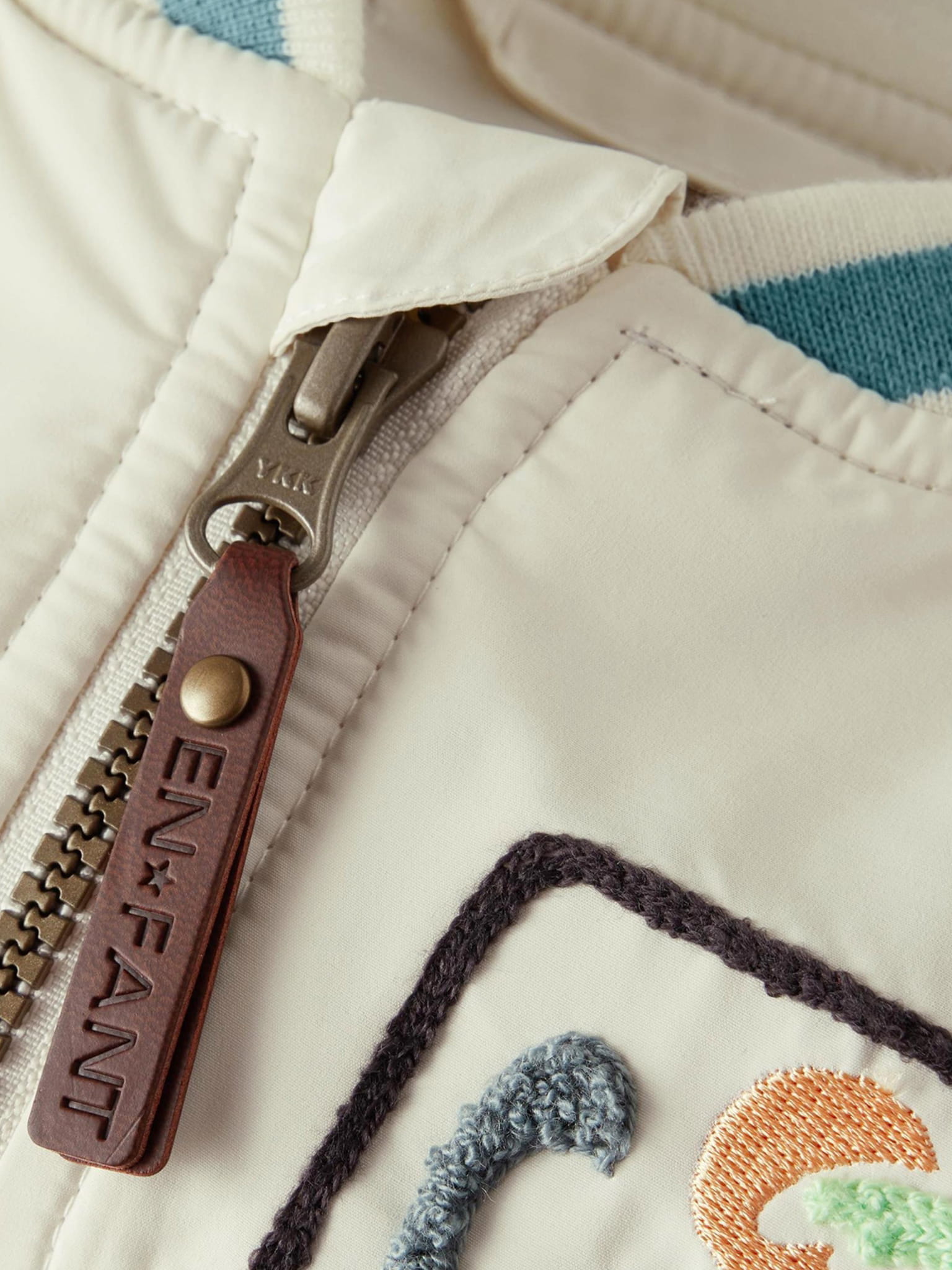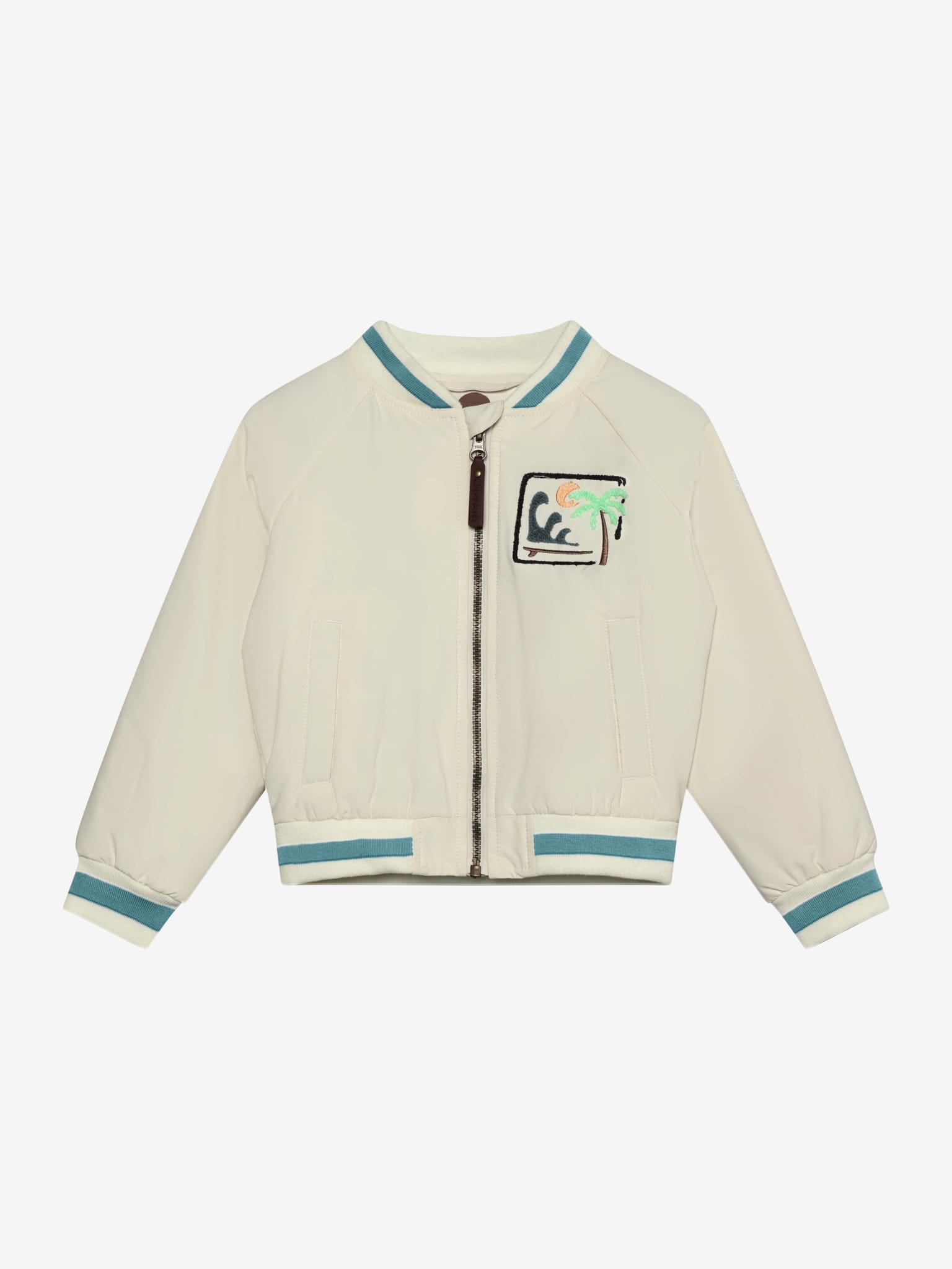 Elegancka kurtka typu bomber od EN FANT. Kurtka ma duży haftowany motyw z tyłu i mały motyw z przodu na klatce piersiowej. Kurtka ma szerokie ściągacze przy rękawach i w pasie. Zapinana na zamek błyskawiczny z osłoną podbródka i kieszenie po bokach. Pokryta powłoką BIONIC FINISH® ECO.