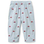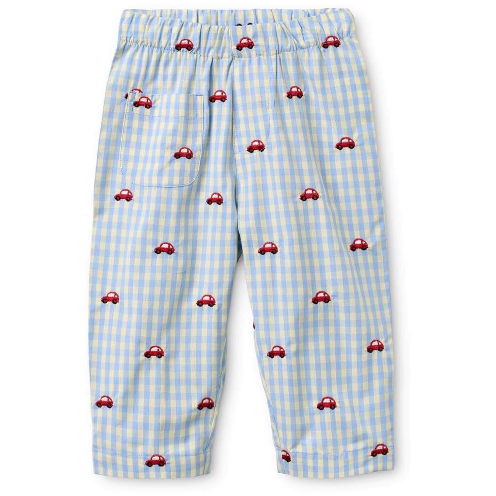 Spodnie Albert są uszyte w jasnoniebieską kratkę gingham z uroczym haftem przedstawiającym samochód. Spodnie są luźno dopasowane, z regulowaną gumką w pasie.