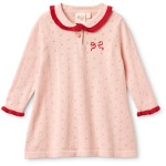 Sukienka Astrid wykonana jest z miękkiej dzianiny bawełnianej pointelle. Zapinana z przodu na guziki w kształcie serca, z czerwoną falbanką przy kołnierzyku i mankietach oraz uroczą haftowaną kokardką.