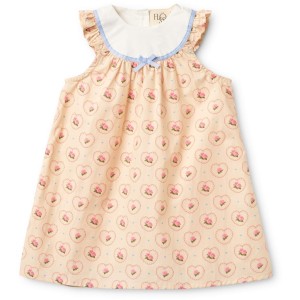 Sukienka Berta wykonana jest z miękkiej popeliny, 100% bawełny, z uroczym nadrukiem w serduszka i róże. Ma falbaniaste rękawy i okrągły karczek z jasnoniebieskim wiązaniem i kokardką z przodu. Bluzka zapinana jest z tyłu na guziki z masy perłowej w kształcie kwiatów.