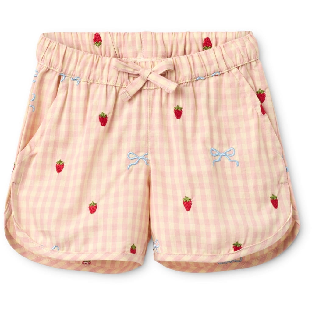 Spodenki Polly wykonane są z bawełny organicznej w kratkę z haftem truskawkowym.