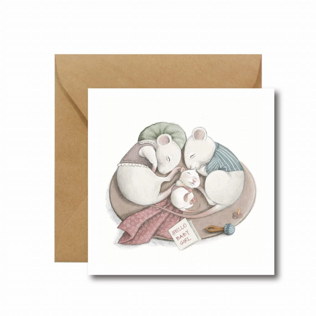 Kartka "Hello Baby" przedstawiająca malutką myszkę śpiącą w koszu z piękną karuzelą nad głową emanuje ciepłem i czułością. To wizualny hołd dla niezwykłego momentu narodzin, momentu, gdy cały świat staje się bardziej magiczny i piękny.