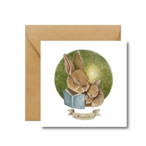 Kartka „Mama” to ręcznie ilustrowana kartka okolicznościowa, która opowiada o bliskości, czułości i wspólnych chwilach. Delikatna ilustracja mamy-króliczki czytającej książkę swojemu dziecku to symbol troski, spokoju i miłości, która zaczyna się od pierwszych dni.