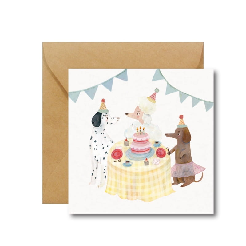 Dla wszystkich miłośników tych uroczych czworonogów mamy kartkę idealną. Elegancki dalmatyńczyk, urocza pudelka i malutka jamniczka w tiulach na urodzinach przy wielkim torcie.