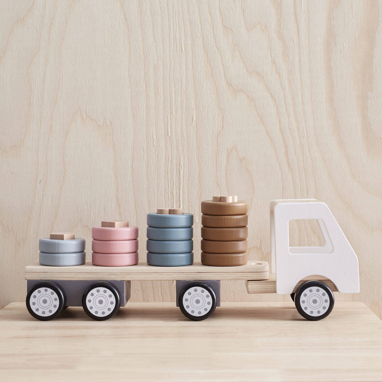 Drewniana ciężarówka. Na przyczepie ciężarówki są cztery kołki o różnych przekrojach, na które można nakładać pierścienie w rozmaitych konfiguracjach.