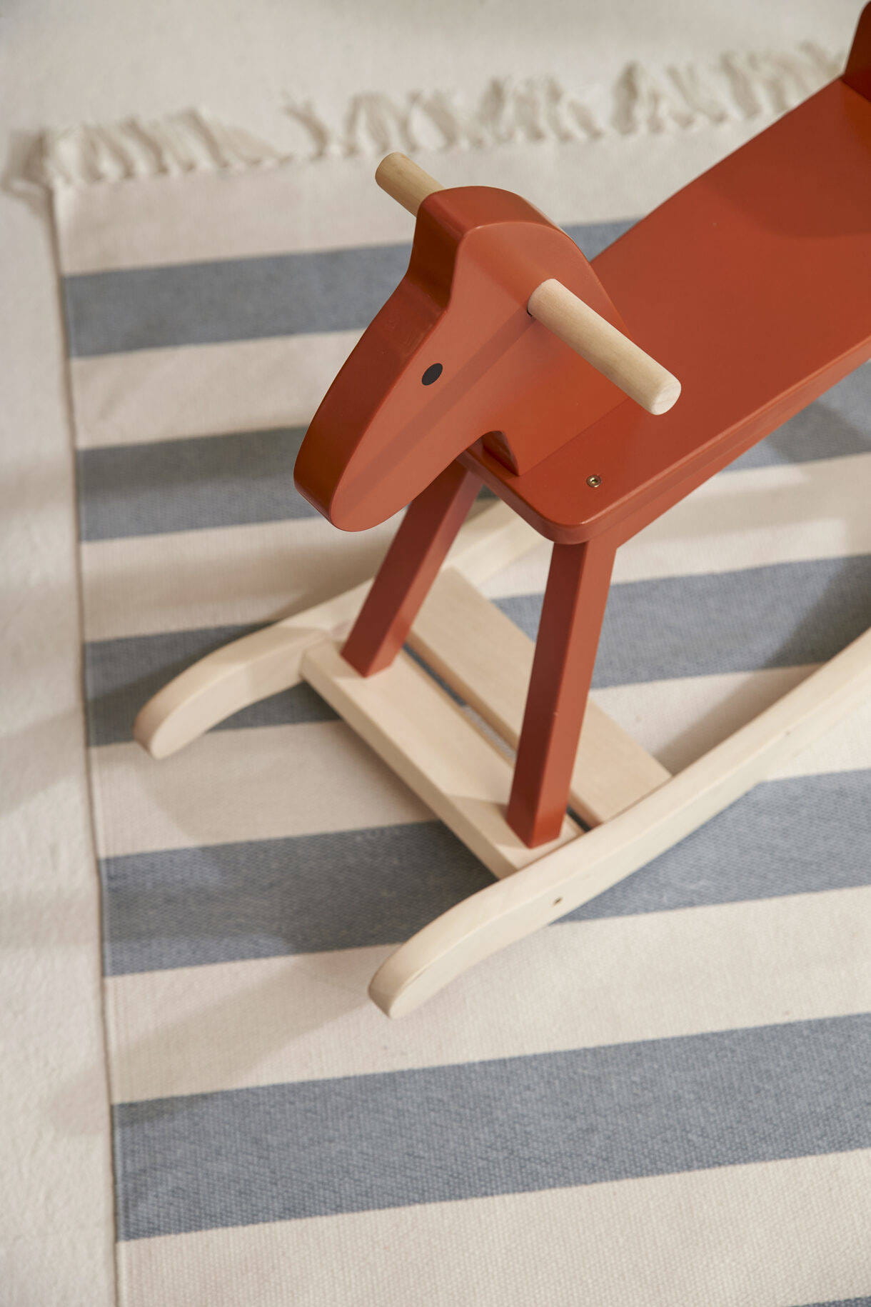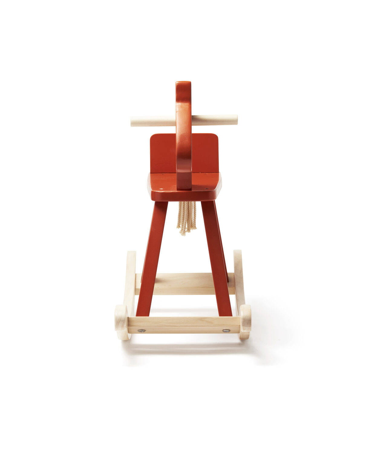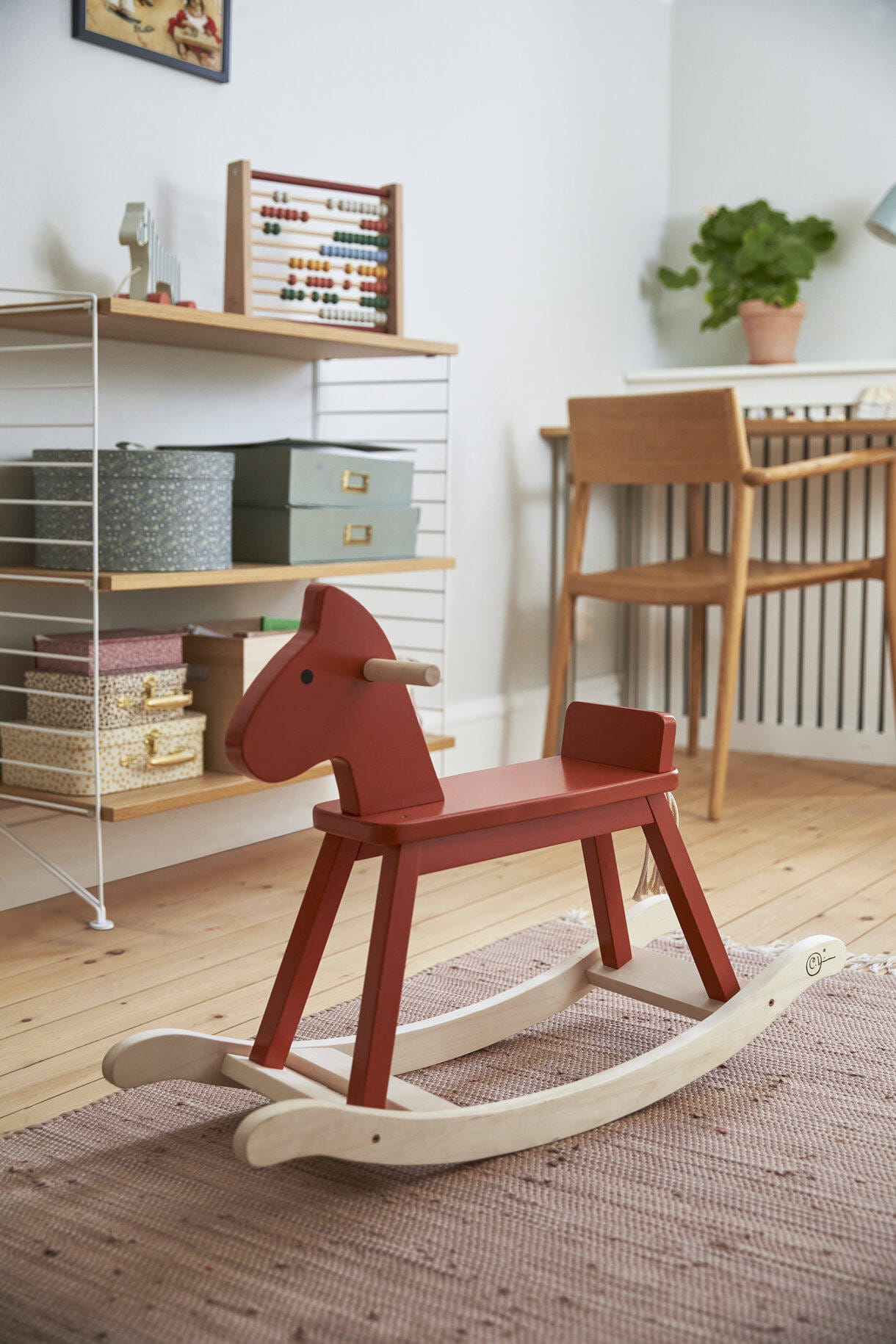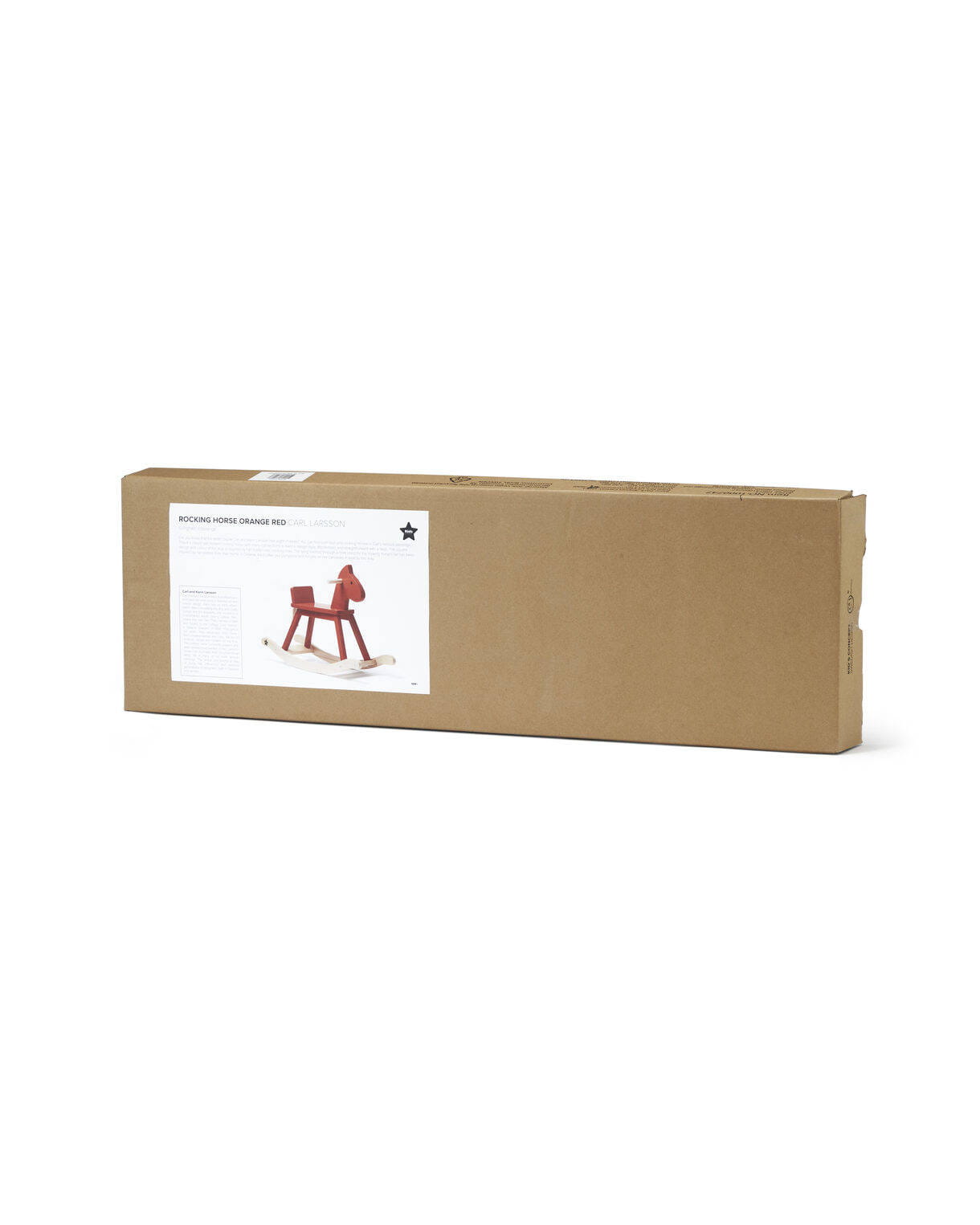 Konik na biegunach z naszej kolekcji Carl Larsson, wykonany z drewna z certyfikatem FSC. Posiada solidne uchwyty i bieguny zapobiegające przewróceniu. To klasyczny, ale wciąż nowoczesny koń na biegunach, którego projekt nawiązuje do stylu Karin. Modernistyczny i prosty, z charakterem. Tekstylia z domu Karin podsunęły nam pomysł na przywiązanie ogona konika do dziurki za siedziskiem. Karin często w ten sposób wiązała pompony i frędzle na obrusach. Kwadratowy przekrój nóg i sam kolor to z kolei nawiązanie do modernistycznego fotela bujanego Karin. Wiele mebli w jej jadalni ma ten fantastyczny czerwono-pomarańczowy odcień.