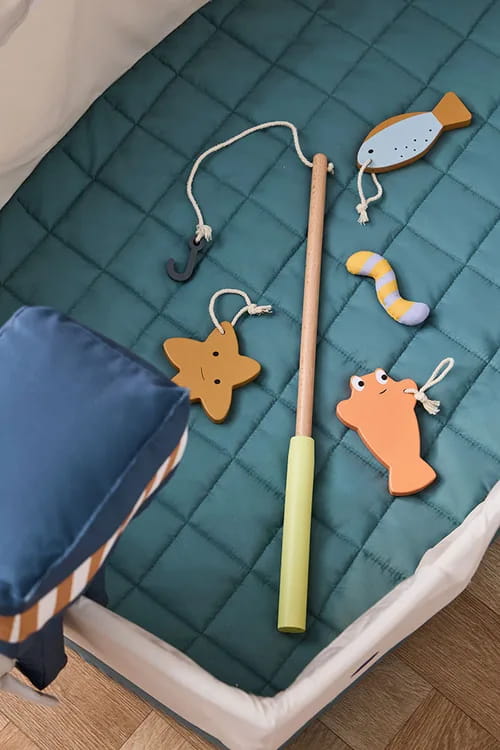 - Pielęgnacja: Łódź: Delikatnie odkurz tkaninę, w przypadku mocnych zabrudzeń możesz ubrać w pralce w 30 C. Prasowanie w średniej temperaturze, Nie suszyć w suszarce bębnowej. Drewniane zwierzątka i wędka: Czyścić wilgotną szmatką. Wytrzeć do sucha czystą szmatką