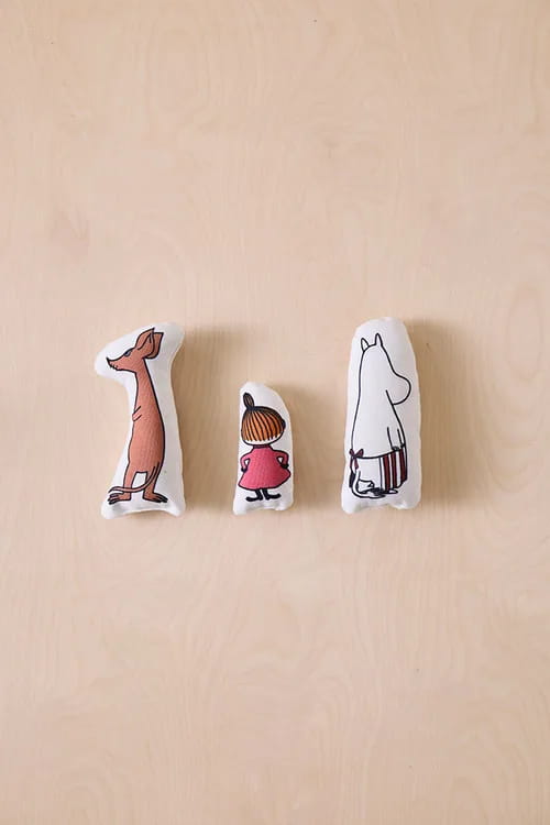 Namiot Muminków wykonany jest z wytrzymałego płótna z certyfikowanej bawełny i drewnianych słupków z certyfikatem FSC. Drzwi mogą być „zawsze otwarte” dzięki uchwytom na zasłony po obu stronach drzwi. Na książki i zabawki, które chcesz zabrać do namiotu, znajdują się dwie wewnętrzne kieszenie. Na zewnątrz znajduje się mniejsza kieszeń, w której znajdziesz trzy małe tekstylne figurki Muminków: Mamma Muminka, Mała Mi i Sniff.