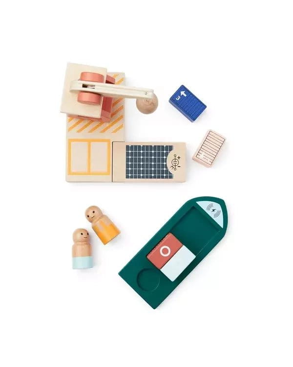 statek teren portu w dwóch częściach dźwig 4 pojemniki z magnesami i 2 osoby