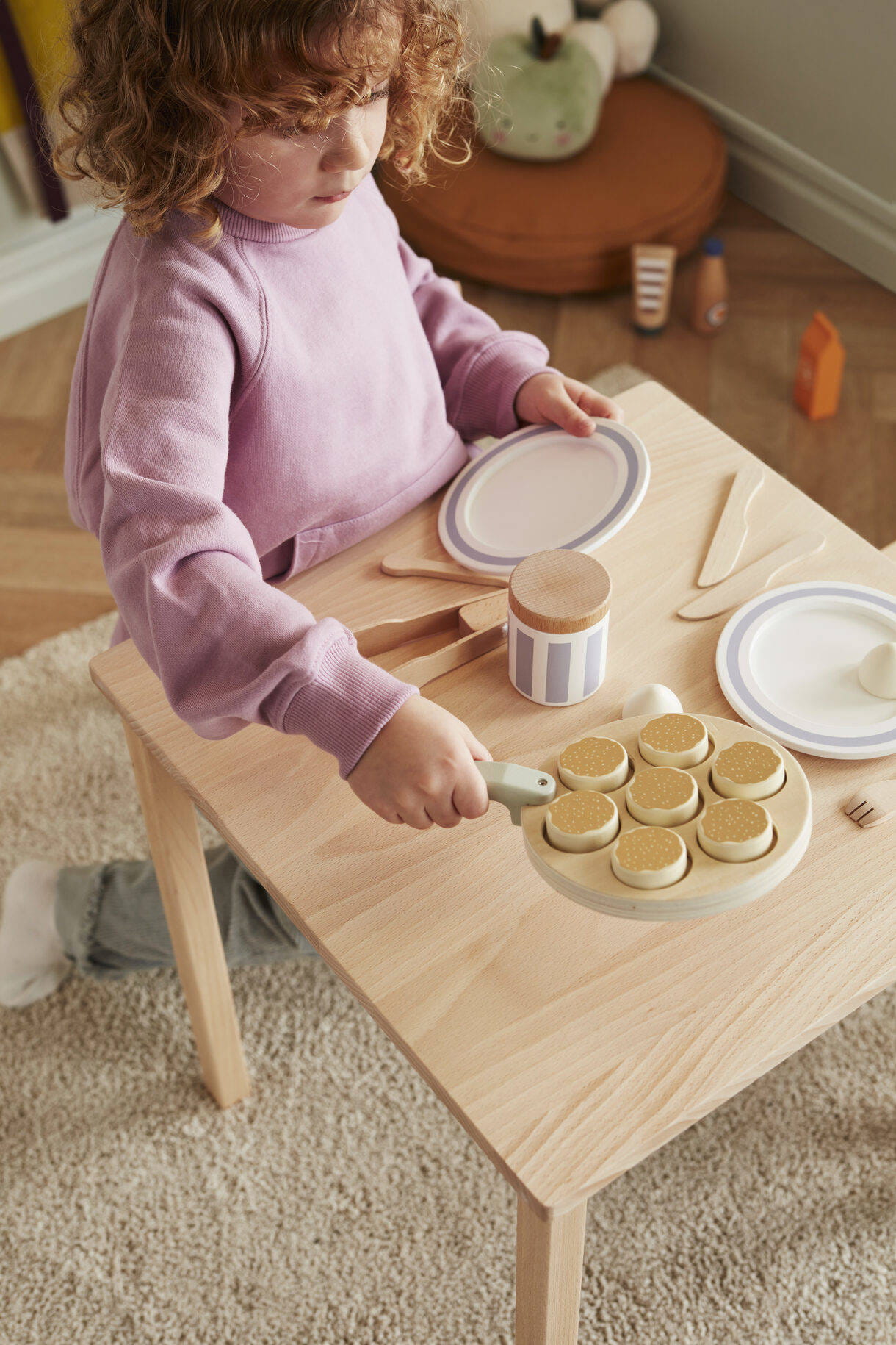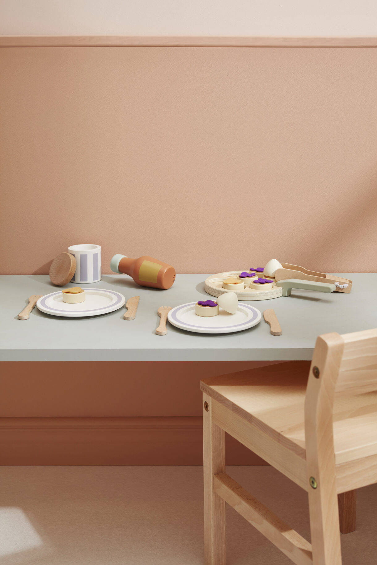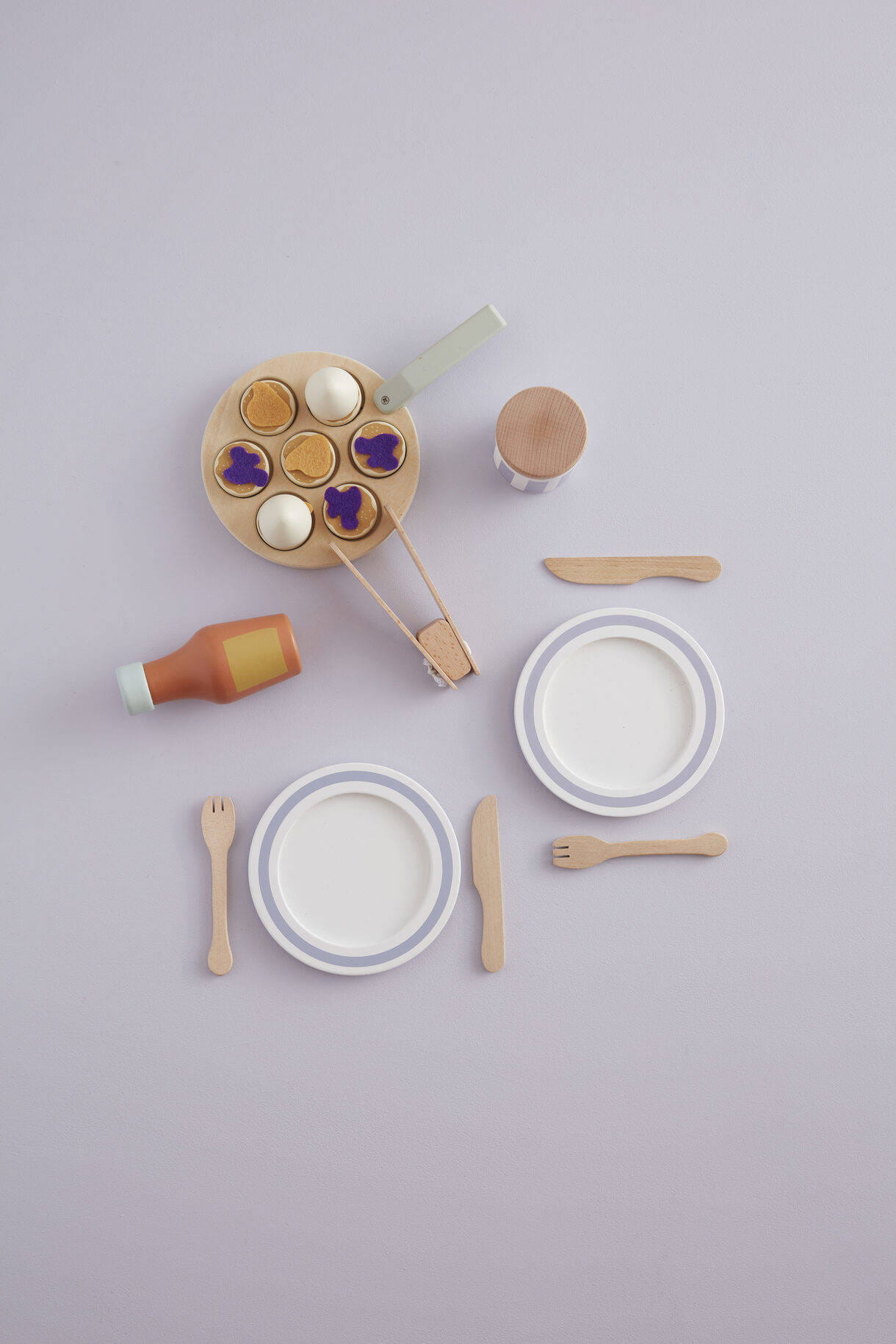 - Patelnia: sklejka Pokrywka słoika z dżemem, naczynia kuchenne: brzoza Porcje bitej śmietany, butelka: schima Talerze, naleśniki: MDF Porcje dżemu: poliester
