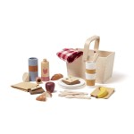 Jabłko i rogaliki dzielą się na cząstki, które możesz ponownie połączyć za pomocą rzepu, umieszczonego po wewnętrznej stronie połówek. Teraz dzielenie się nimi z przyjaciółmi jest bardzo łatwe. Zarówno butelka lemoniady, jak i termos mają zdejmowane zakrętki, dzięki którym odgrywanie ról jest jeszcze bardziej realistyczne. Wszystkie elementy, z wyjątkiem ściereczek piknikowych i torebek na kanapki, są wykonane z drewna, co oznacza, że można się nimi bawić przez długi czas. Wskazówka! Kosz piknikowy może być również używany jako kosz na zakupy, gdy Twoje dziecko zechce się wybrać na targ.