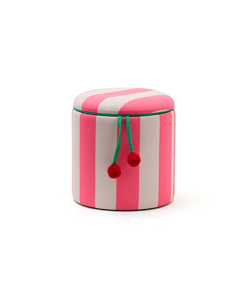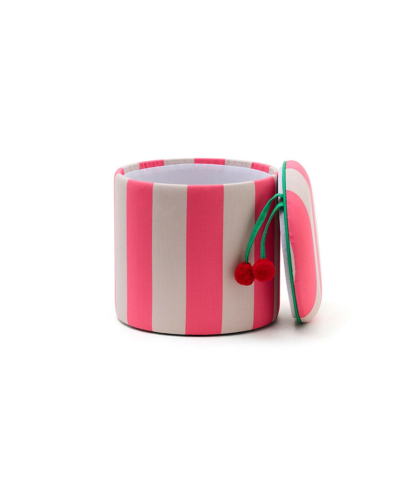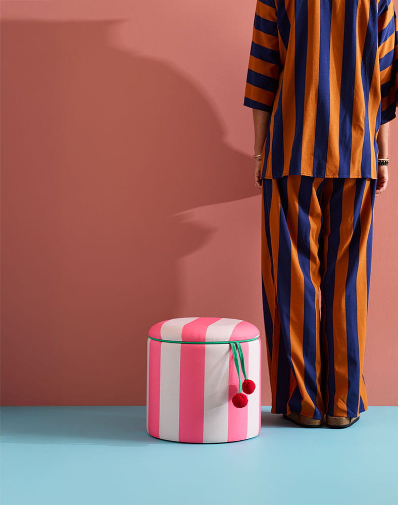 Sprzątanie też może być zabawą - nawet po całym dniu intensywnej zabawy. Ta pasiasta pufa z pomponami powstała z myślą o tym, aby codzienne przedmioty były jednocześnie praktyczne i radosne. Łączy funkcję siedziska oraz pojemnego schowka, wprowadzając do wnętrza lekkość i kolor.