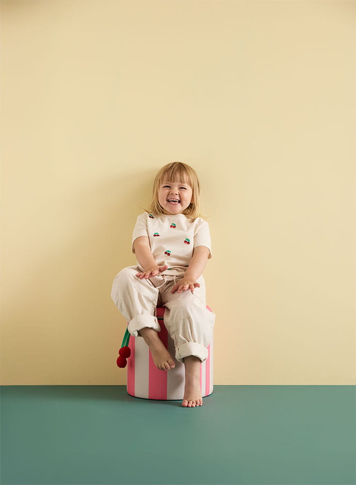 Cylindryczny kształt i miękka tkanina nadają pufie przytulny charakter, a dekoracyjne pompony dodają jej wyjątkowego uroku. Z takim radosnym pomocnikiem może być łatwiej zmotywować dziecko do odkładania zabawek na miejsce.