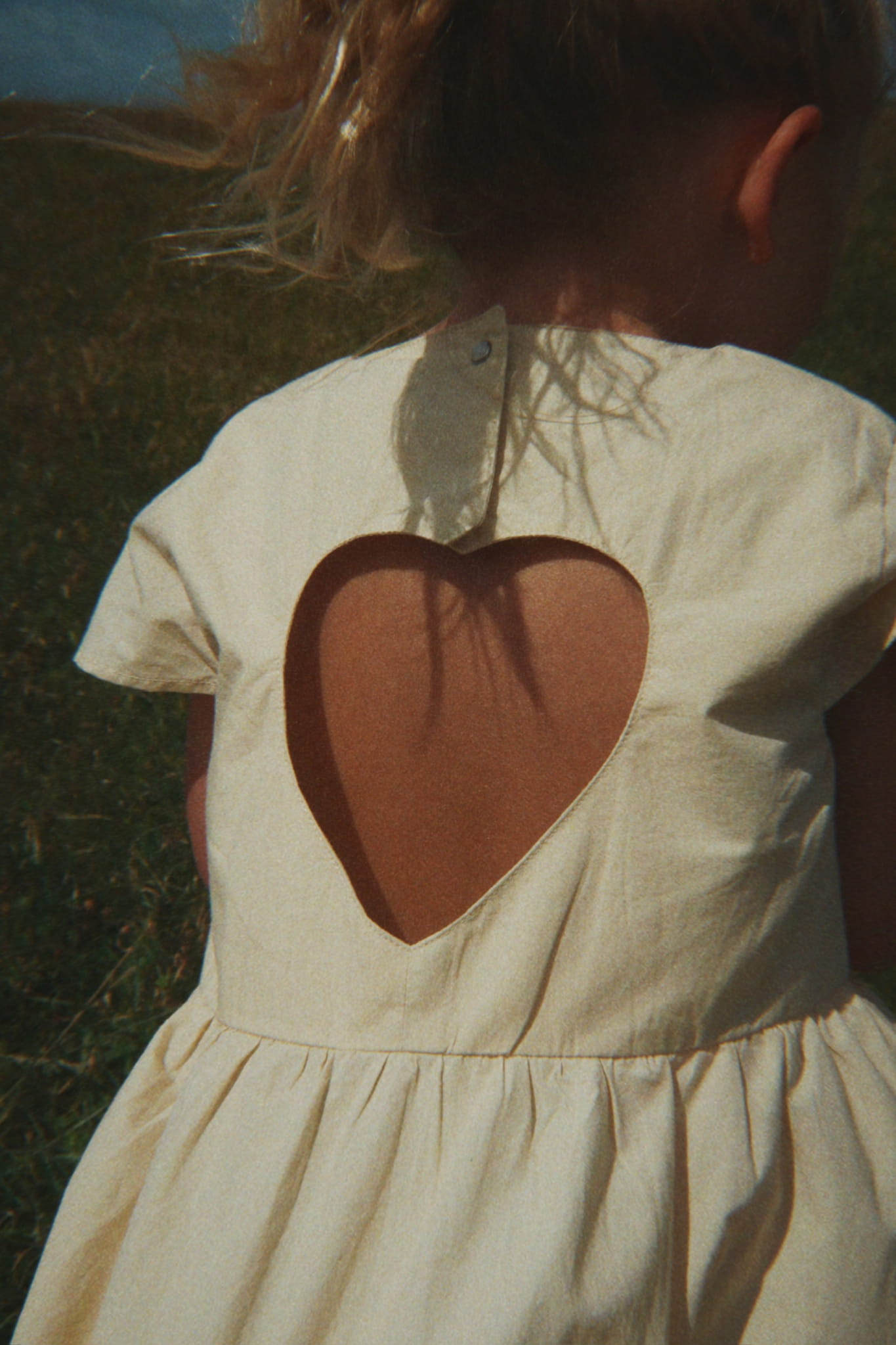 Miękka bawełniana sukienka o swobodnym, luźnym kroju. Tył sukienki zdobi wycięcie w kształcie serca, starannie wykończone przeszyciami wzdłuż krawędzi, co nadaje jej wyraźny kontur i dodaje zabawnego, romantycznego akcentu do prostego i eleganckiego fasonu. Wykonana ze 100% bawełny organicznej GOTS, certyfikowanej przez CU1094701.