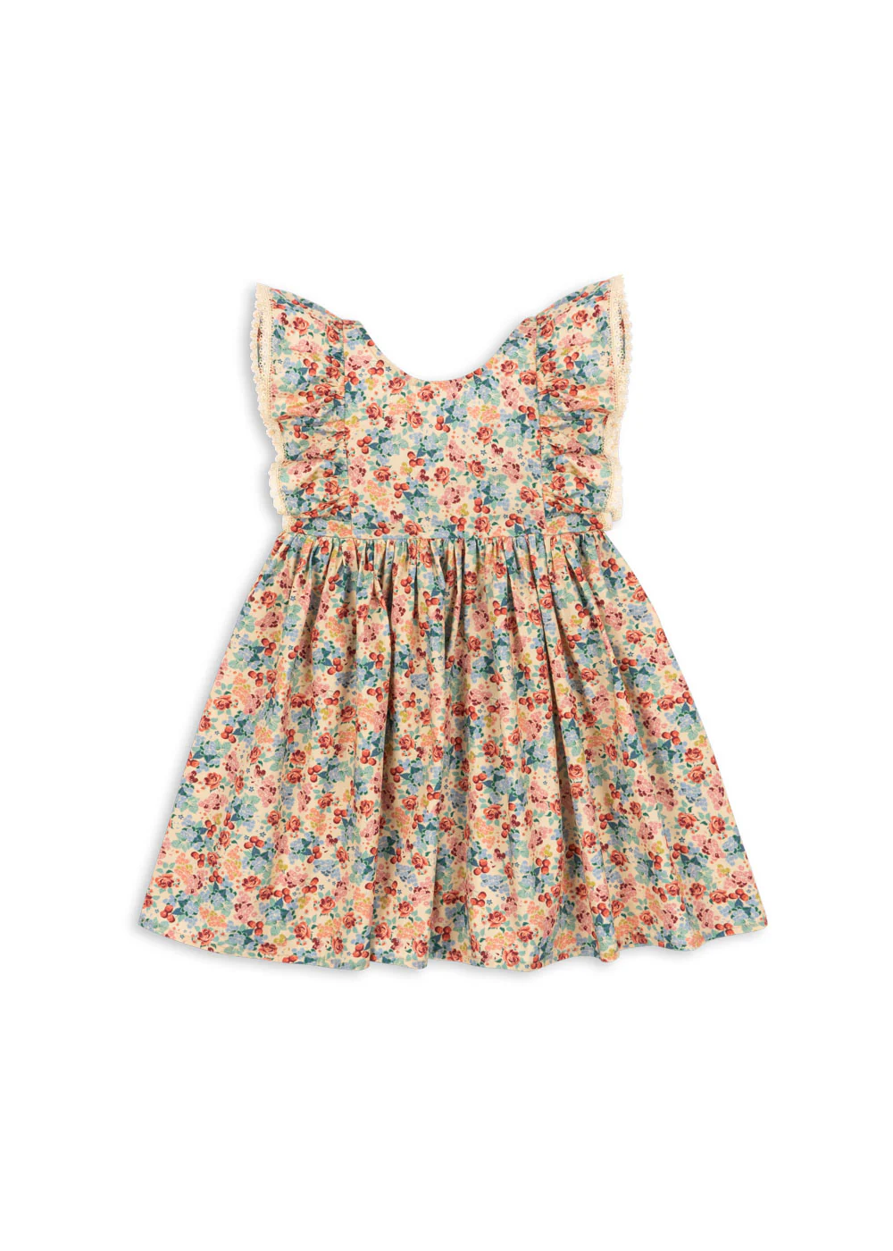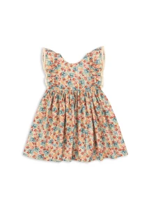 Miękka letnia sukienka wykonana w 100% z bawełny organicznej. Sukienka ma falbaniaste ramiączka z delikatnymi koronkowymi detalami, głębokie wycięcie na plecach i rozkloszowany dół.