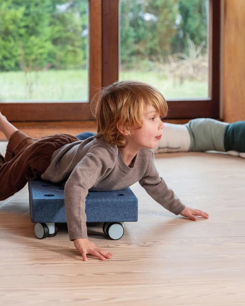 Najnowszy dodatek do zestawów MODU – Scooter Board– nadaje zabawie z MODU nowy wymiar. To prosta, ale wielofunkcyjna zabawka pobudzająca rozwój motoryki i wyobraźni niemowląt i starszych dzieci. Położenie malucha na platformie na kółkach, którą rodzic może poruszać, urozmaici czas spędzony na brzuszku. Po odłączeniu kółek, Scooter Board zamienia się w deskę do bujania. Nawe delikatne ruchy i stymulacja zmysłów wywołują uśmiech na twarzy malucha, a to dopiero początek zabawy! Kiedy dziecko podrośnie, może korzystać ze swobody poruszania się, samodzielnie kręcąc się niej. Po odpięciu kółek, Scooter Board stanie się natomiast deską równoważną, dając mnóstwo frajdy mały surferom. Połączenie jej z innymi elementami klocków MODU, pozwala tworzyć konstrukcje, których nie ogranicza nic, poza fantazją dziecka.