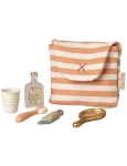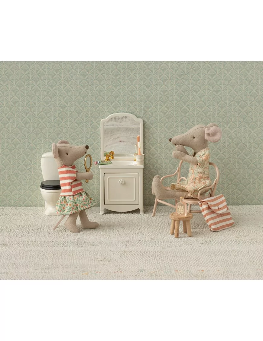 Mała torebka pełna wszystkiego, czego potrzeba przed snem: szczoteczka, kubeczek, lusterko, krem i buteleczka perfum. Idealna do tworzenia scenek i wielu opowieści o rodzinie myszek.