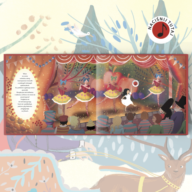 Naciśnij nutkę na każdej stronie, by dzięki muzyce Czajkowskiego poczuć atmosferę magicznego świata zabawek i ich ekscytujących przygód. Prosty tekst, piękne ilustracje i wyjątkowa muzyka – niezależnie od wieku czytelnika – rozbudzą wyobraźnię i wciągną w wir zaczarowanych przygód Klary.