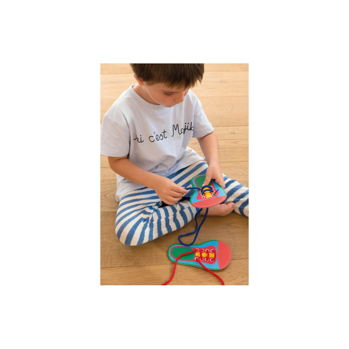 Wiązanie butów jeszcze nigdy nie było takie proste! Zestaw składa się dwóch par butów oraz 4 różnokolorowych sznurków. Zadaniem dziecka jest przeplatanie sznurówek przez dziurki w bucie. Jest to doskonałe połączenie zabawy z nauką! Dodatkowo dziecko trenuje cierpliwość, zdolności motoryczne, koordynację ręka-oko jednocześnie rozwija wyobraźnię i kreatywność.