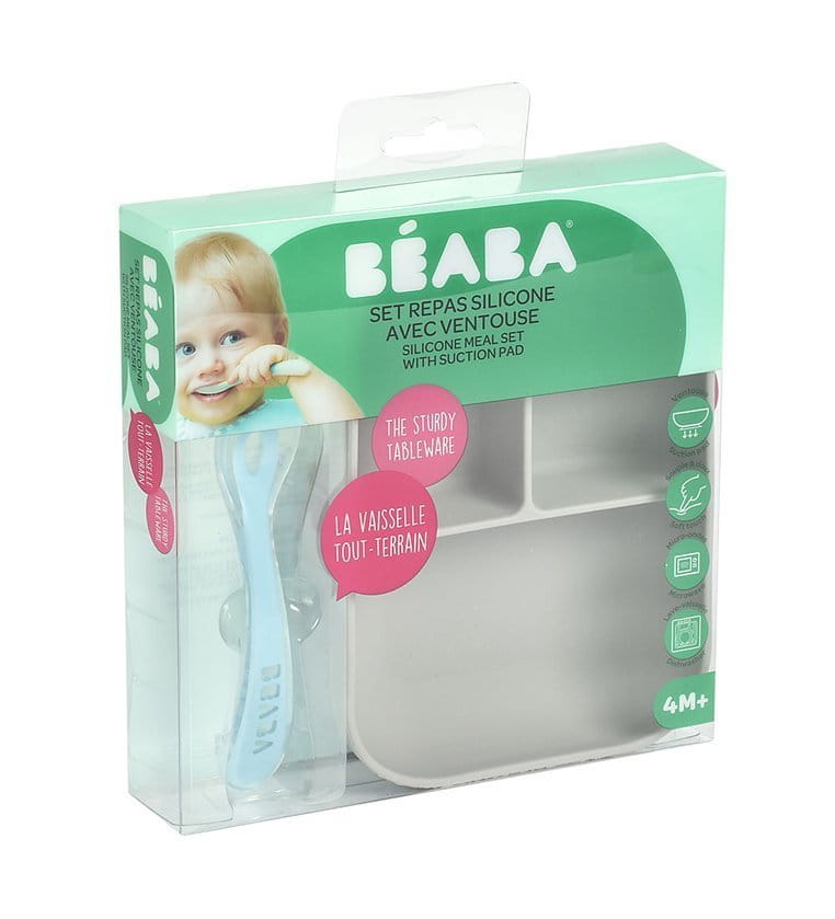 Beaba Komplet naczyń z silikonu trójdzielny talerz z przyssawką + łyżeczka Grey