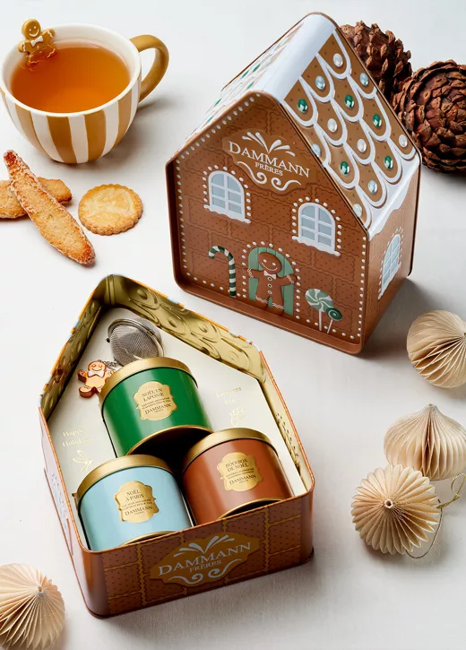 Urokliwe metalowe pudełko w kszałcie domku z piernika skrywa trzy wyjątkowe mieszanki o świątecznym charakterze. W jego wnętrzu znajdują się trzy puszki po 40 g – dwie z herbatą i jedna z naparem inspirowanym Bożym Narodzeniem – oraz ozdobne sitko do herbaty. Po opróżnieniu zestawu pojemnik zyskuje drugie życie jako elegancka puszka na ciasteczka, doskonała do serwowania i przechowywania domowych świątecznych wypieków.