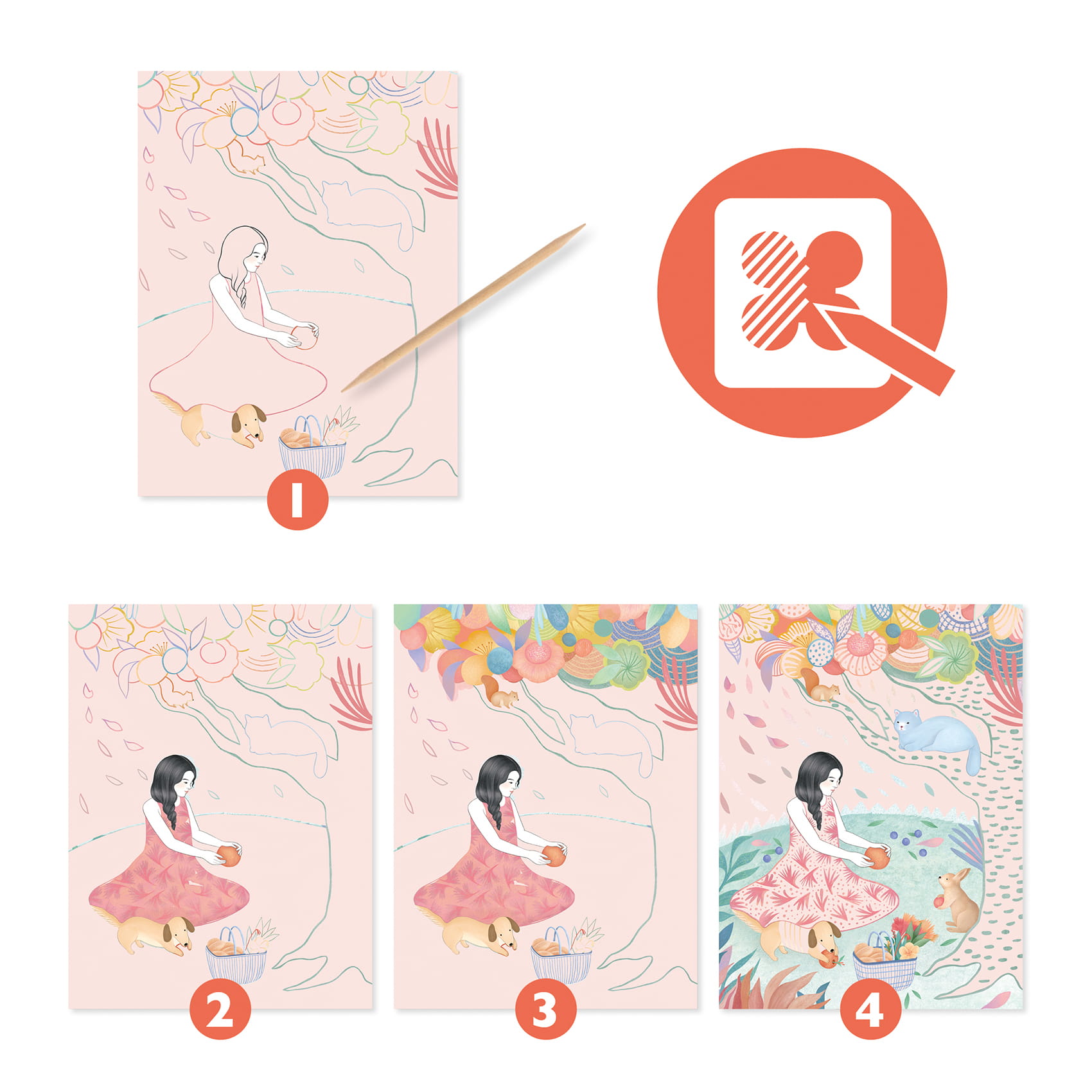 Załączonym rysikiem należy zdrapywać według instrukcji kolejne fragmenty ilustracji a otrzymamy 4 piękne obrazki. Zestaw zawiera: 4 obrazki do zdrapania, 1 patyczek do zdrapywania i książeczkę z podpowiedziami krok po kroku.