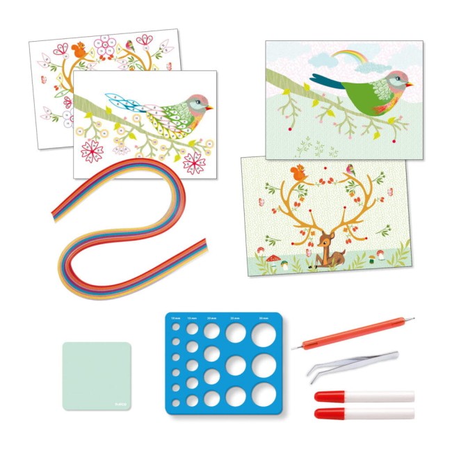 Kolorowe ruloniki papieru stają się ptakami i kwiatami! Dzięki technice "Quilling" powstają piękne dzieła sztuki. Dzięki specjalnemu prętowi i szablonowi paski papieru są skręcane na małe rolki i dekorują obrazek. Zestaw służy do tworzenia trójwymiarowych obrazów.