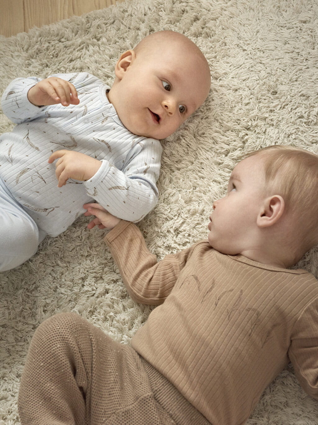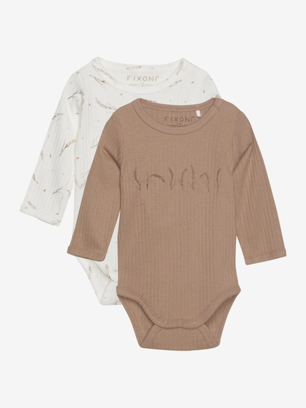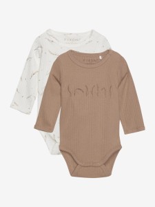 Zestaw składa się z dwóch body - jednego z nadrukiem na całej powierzchni i jednego w jednolitym kolorze. Zapinane na zatrzaski z tyłu między nogawkami.