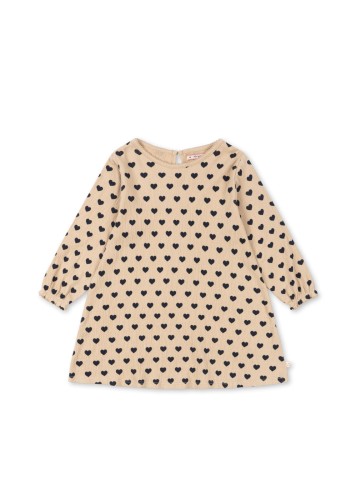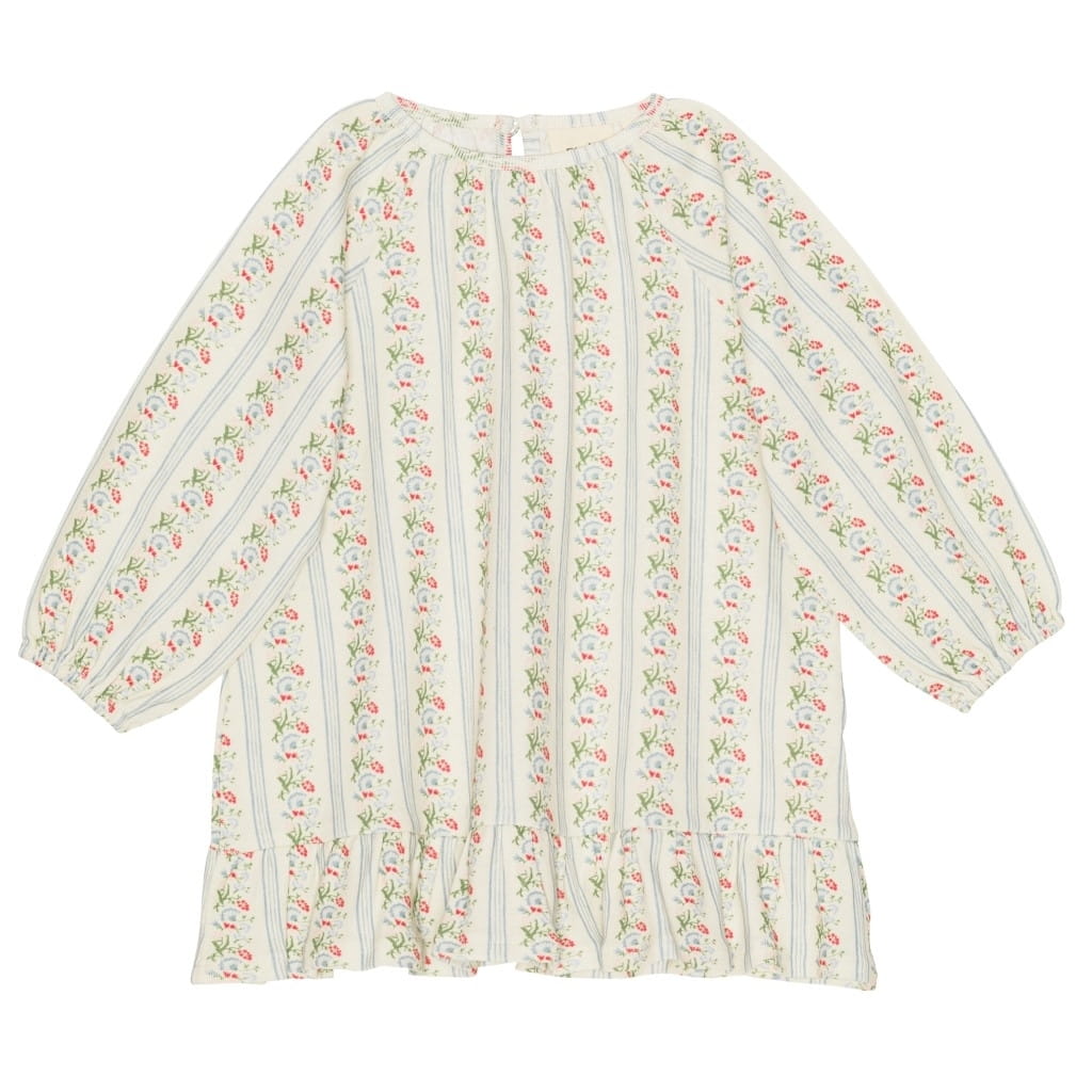 Sukienka Abigail Jersey jest wykonana z naszego miękkiego bawełnianego dżerseju. Ma świetną rozciągliwość, dzięki czemu jest miękka i wygodna. Posiada rękawy raglanowe z gumką, okrągły dekolt, guzik pokryty materiałem przy dekolcie i falbaniasty brzeg.