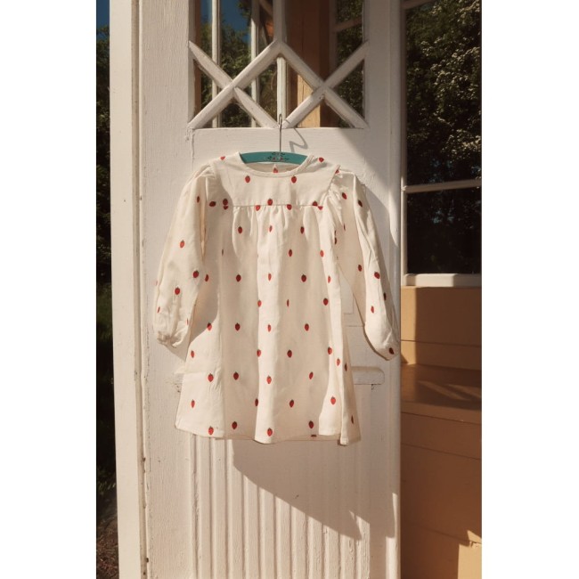 Sukienka Cora to biała sukienka jeansowa z haftem truskawkowym, wykonana z bawełny. Ma okrągły dekolt, rękawy typu raglan z gumką i półpliskę z tyłu, która ułatwia otwieranie.