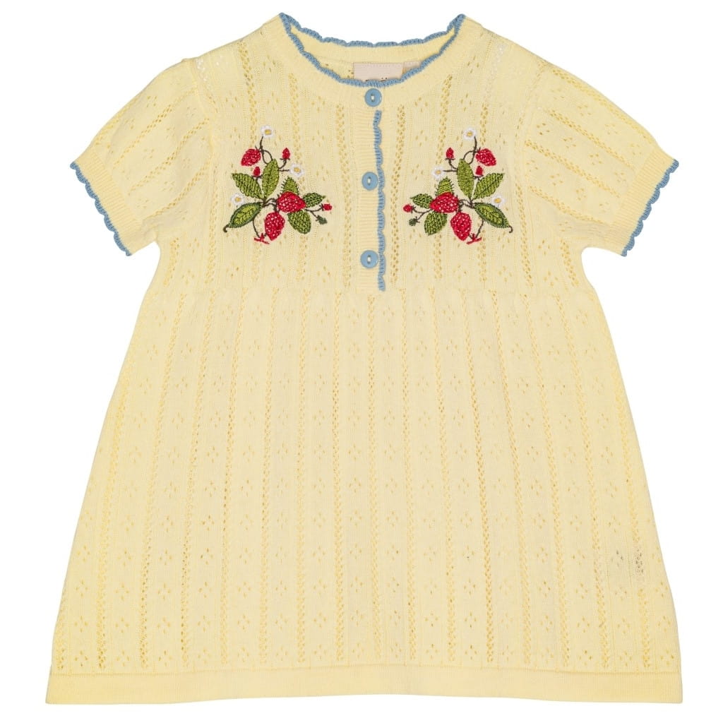 Sukienka Dream z dzianiny pointelle wykonana jest z miękkiej bawełny. Ma obszycia w kształcie muszelki w kontrastowym kolorze, niebieskie guziki, okrągły dekolt z półplisą i haftowane kwiaty.