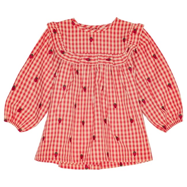 Sukienka Molly LS wykonana jest z bawełny w kratkę z haftem w truskawki. Z półmiskowym kołnierzem i detalami z falbankami. Widoczna plisa z przodu z czerwonymi guzikami, dyskretnie bufiaste rękawy i marszczony karczek z przodu i z tyłu.