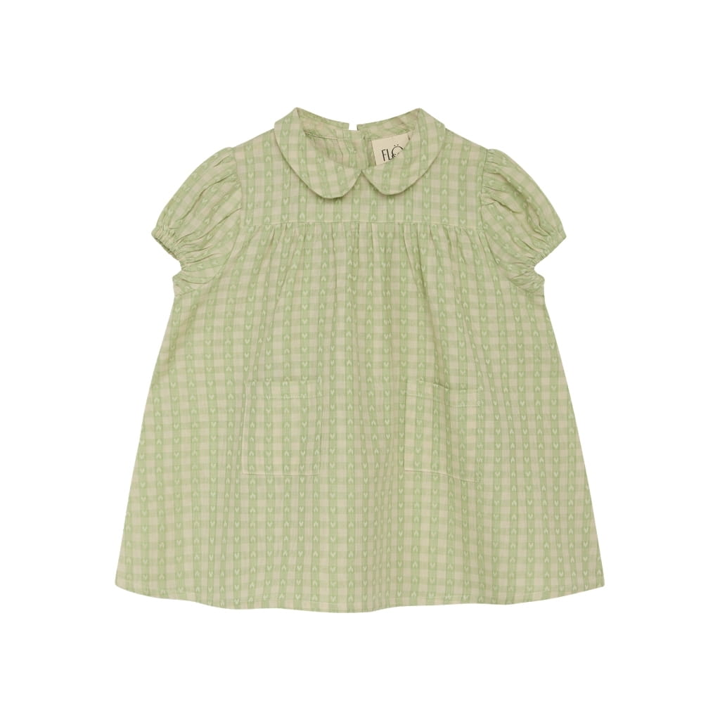 Sukienka Stella z krótkim rękawkiem wykonana jest z bawełny organicznej. Ma kołnierzyk Piotrusia Pana, marszczony karczek, zapięcie na guziki z przodu i bufiaste rękawy.