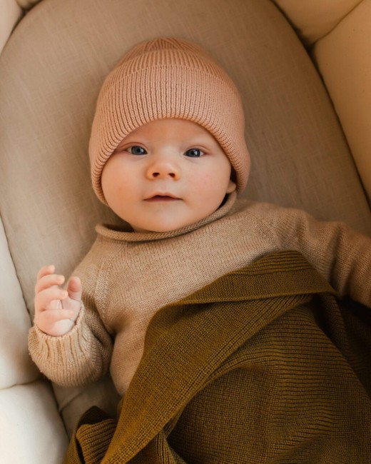 Bezszwowa dzianinowa czapka wykonana w 100% z wełny merynosów, idealna dla maluszka, który dopiero wchodzi w ten świat. Zrób dodatkowe zagięcie na pierwsze dni.