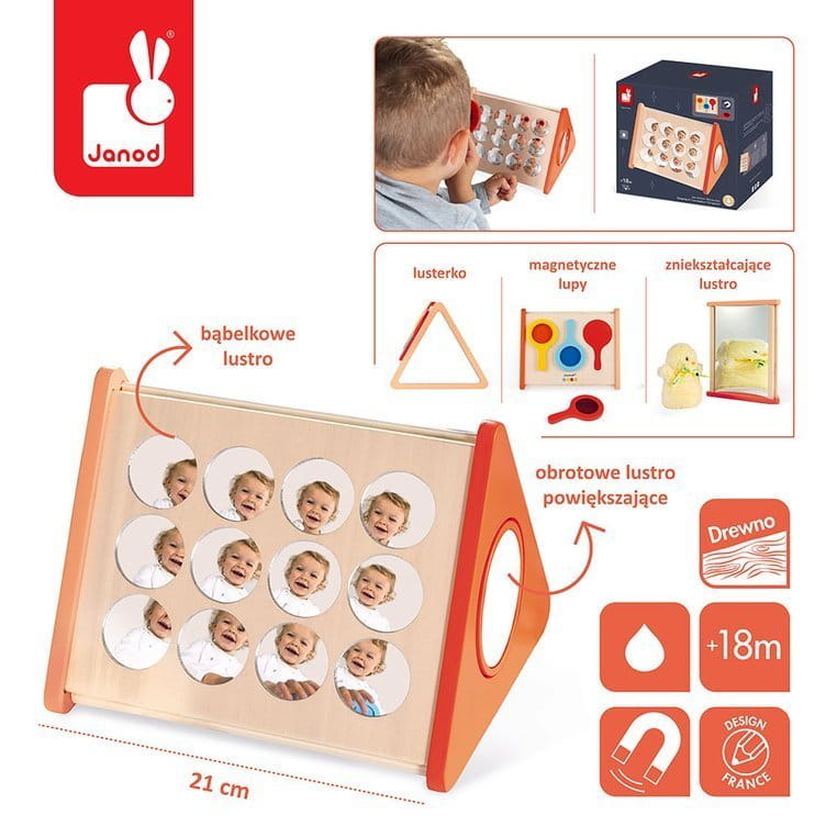 Drewniana piramida Lustra z serii Essentiel francuskiej marki JANOD rozwija u dziecka wiele kluczowych umiejętności, m.in. rozpoznawanie siebie, adaptację oka do zmieniających się obrazów, orientację w przestrzeni, koncentrację i cierpliwość. Graniastosłup o podstawie w kształcie trójkąta z każdej strony oferuje nowy widok – na jego długich bokach znajdują się kolejno: tzw. lustro bąbelkowe, na które składa się 12 małych, okrągłych lusterek, lustro zniekształcające oraz zestaw trzech magnetycznych lup ze szkiełkami w różnych kolorach (żółtym, niebieskim i czerwonym), które pozwalają „patrzeć na świat” w innych kolorach. Na podstawach bryły umieszczone jest z jednej strony normalne trójkątne lustro, a z drugiej - okrągłe, obracające się lusterko powiększające. Zabawka rozbudza ciekawość, zaskakuje i rozbawia.