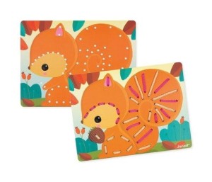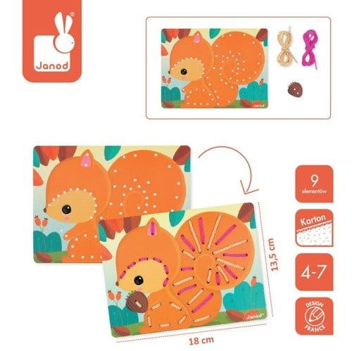 Zabawka manipulacyjna – przeplatanka Zwierzątka francuskiej marki JANOD składa się z 6 plansz – obrazków, wykonanych z solidnego kartonu i przedstawiających: wiewiórkę, sówki, rybki, motyla, ślimaki i żółwie. Plansze te posiadają wiele otworów, przez które należy przepleść dołączone do nich sznurki (po dwa), ozdabiając obrazek, oraz element dodatkowy, np. orzeszek lub kwiatek, który trzeba przymocować do każdej z nich w odpowiednim miejscu. Przeplatając sznurki dziecko rozwija koordynację ruchową i motorykę, poznaje kolory i uczy logicznego myślenia. Plansze zaciekawiają i zapewniają długie godziny angażującej zabawy, a gotowe obrazki mogą stać się elementem dekoracyjnym dziecięcego pokoju lub zostać użyte ponownie, w jeszcze bardziej twórczy sposób. Zestaw zaprojektowano we Francji. Idealnie nadaje się na prezent.