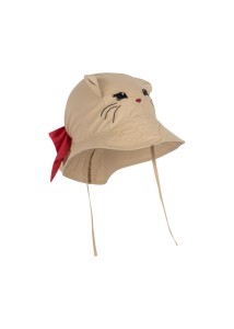 Kapelusz przeciwsłoneczny z motywem kota, uszami kota na górze i ozdobną kokardą z tyłu. Zaprojektowany ze sznurkami, które można zawiązać pod brodą. Materiał: 100% bawełna organiczna. GOTS, Organic, certyfikowany przez CU1094701.