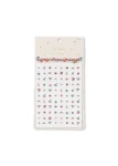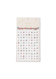 Trzy arkusze papieru z różnymi naklejkami na paznokcie, które można łatwo nakładać i usuwać.