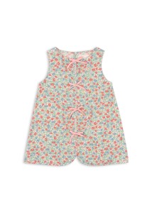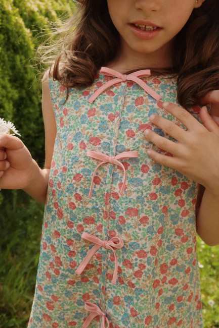 Sukienka bawełniana bez rękawów. Zaprojektowana z kokardkami z przodu i pojedynczym guzikiem z masy perłowej z tyłu dla łatwego zakładania. Materiały: 98% bawełna organiczna, 2% elastan. GOTS, Organic, certyfikowany przez CU1094701.