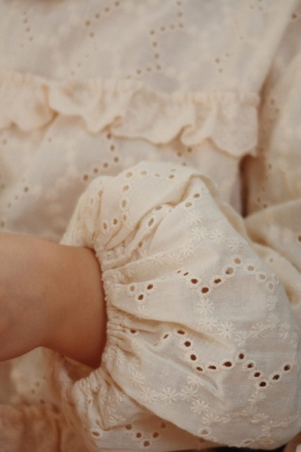 Sukienka bawełniana z delikatnego haftu angielskiego z falbankami na całej powierzchni. Zaprojektowana z elastycznymi mankietami. Wykonana w 100% z bawełny.