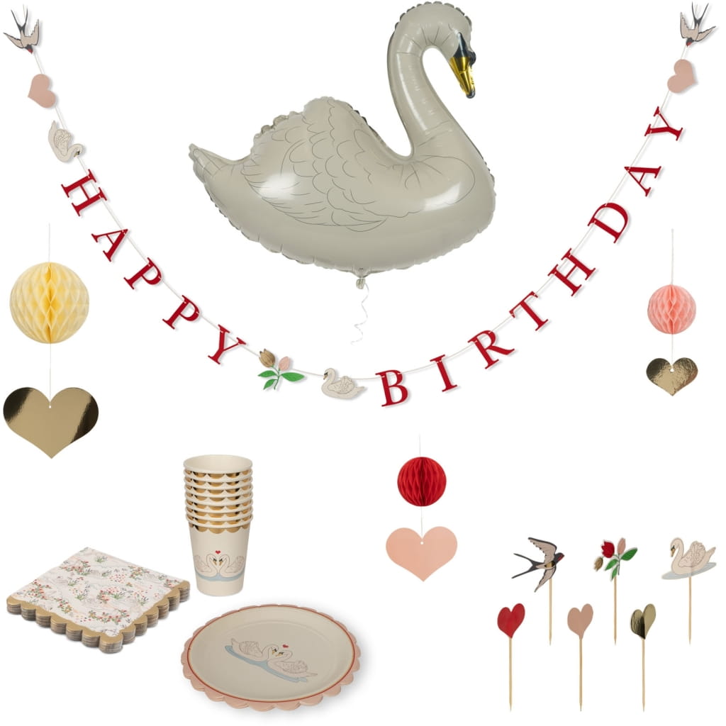 Zawiera: 8x talerze 8x kubki 1x balon 1 x girlanda 16x serwetek 12x topper na ciasto 3 x papierowy pompon Materiały: Kubki: papier, talerze: papier, serwetki: papier, girlanda: papier, sznurek bawełniany, balon: folia aluminiowa, toppery na ciasta: papier, kij bambusowy .