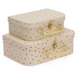 Konges Slojd zestaw dwóch walizek. Każda w innym rozmiarze. Walizki posiadają metalowe uchwyty w kolorze złotym. Idealnie sprawdzą się jako dekoracyjny element dziecięcego pokoju. Każde dziecko pomieści w nich swoje największe skarby.