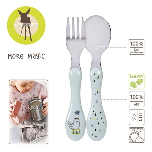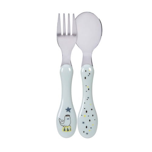 Komplet sztućców ze stali nierdzewnej niemieckiej marki LASSIG, składający się z widelca i łyżki. Sztućce są lekkie i mają specjalnie profilowane kształty, co ułatwia dzieciom nabieranie pożywienia. Rękojeść z tworzywa – w bardzo jasnym odcieniu niebieskiego z motywem radosnej foki w muszce na cyrkowym podeście (widelec) oraz gwiezdnego pyłu w kolorach ciemnoniebieskim, czarnym, szarym i żółtym (łyżka) – również została zaprojektowana tak, by idealnie pasować do dziecięcej rączki. Dzięki przewężeniu łatwo ją złapać i utrzymać.