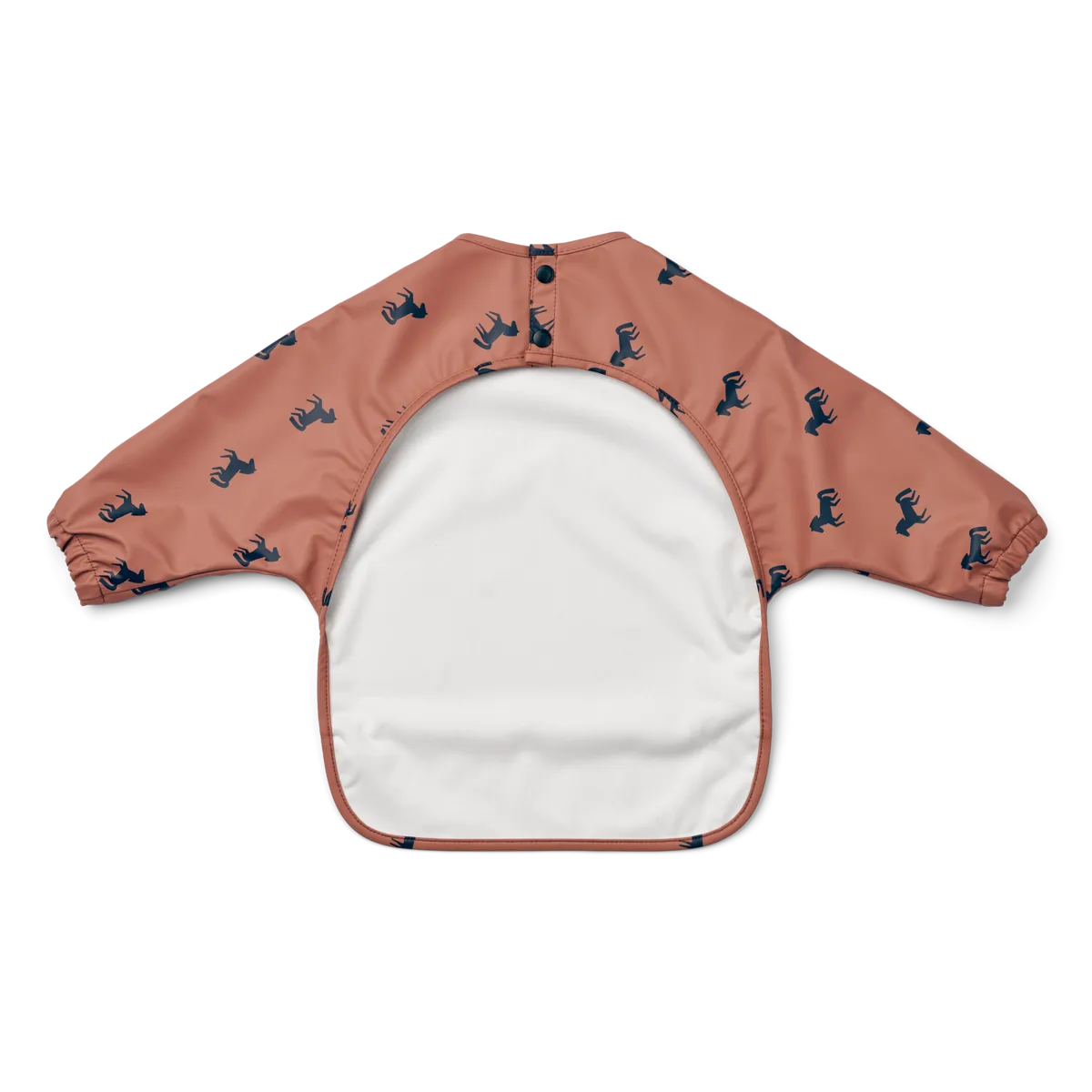Miękki i przyjemny w dotyku śliniak z długim rękawem oraz kieszonką na okruszki.