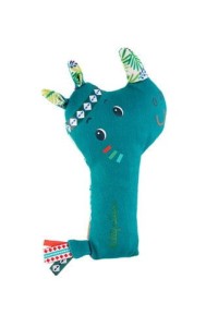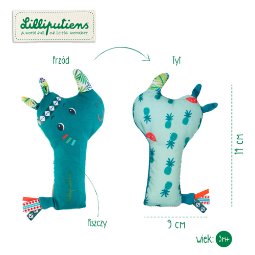 Piszczałka Nosorożec Marius belgijskiej marki Lilliputiens to aktywizująca zabawka dla niemowląt. Ma postać radosnego niebieskiego Nosorożca Mariusa, który po naciśnięciu wydaje przyjemny dla ucha piszczący dźwięk. U dołu piszczałki znajdują się stymulujące zmysł dotyku materiałowe wypustki. Zabawka rozwija małą motorykę (chwytanie i naciskanie), aktywizuje zmysł słuchu (piszczy) oraz uczy dostrzegania zależności przyczynowo-skutkowych.
