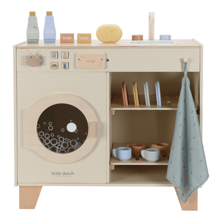 Zamień codzienne obowiązki w pełną radości zabawę! Drewniana pralka ze zlewozmywakiem od Little Dutch to wyjątkowy zestaw, który pozwoli dzieciom wcielić się w rolę małych gospodarzy domowych. W realistyczny, ale zarazem bezpieczny i kreatywny sposób dzieci mogą „prać”, „zmywać” i dbać o porządek w swoim domowym kąciku.
