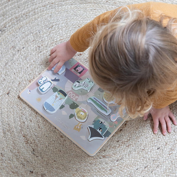 Drewniane puzzle Zoo to 9 różnych figurek i kształtów, które służą do dopasowania w odpowiednie miejsce. Puzzle są lekkie i wygodne do chwytania przez małe rączki. Sympatyczne zwierzątka zachęcają do zabawy. Można się również bawić figurkami samodzielnie. Ładnie zapakowane w kartonik z szybką. Idealne na prezent.