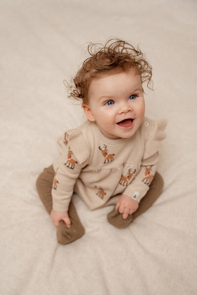 Sukienka z długim rękawem Christmas od Little Dutch. Nadszedł świąteczny czas! Ta urocza i miękka dzianinowa sukienka ze wzorem w renifery to idealny strój na Boże Narodzenie. Ma długie rękawy z eleganckimi falbankami, które dodają jej uroku. Wykonana z certyfikowanej bawełny organicznej. Stanowi świetne uzupełnienie do pozostałych ubranek od Little Dutch.