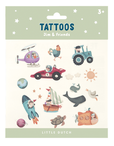 Tatuaże Jim & friends od Little Dutch. Te urocze tatuaże wywołają uśmiech na twarzy każdego dziecka! Zestaw zawiera tymczasowe tatuaże z motywami Waszych ulubionych kolekcji od Little Dutch z ich uroczymi bohaterami oraz uroczym Jimem. Idealnie sprawdzą się jako zabawny dodatek na przyjęcie dla dzieci lub urodziny. Tatuaże są odpowiednie dla dzieci w wieku od 3 lat i są bezpieczne dla skóry dzieci. Łatwa aplikacja i zmywanie. Ten produkt świetnie sprawdzi się jako drobny upominek.